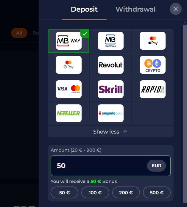 Deposits start at €20. You can deposit by credit card, Apple Pay, Google Pay, Skrill, Neteller, wire transfer, cryptocurrencies (bitcoin, ethereum, solana, litecoin), payment by phone...