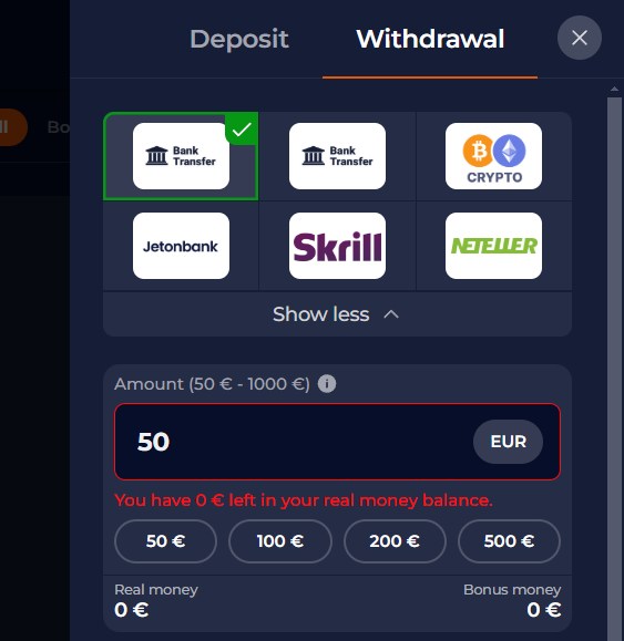 Before withdrawing, you'll need to verify your identity (ID card, passport or license). Once your account has been validated, you can withdraw by bank transfer, Skrill, Neteller or cryptocurrency (bitcoin, ethereum, solana, litecoin). The transfer will be made within 24 hours!