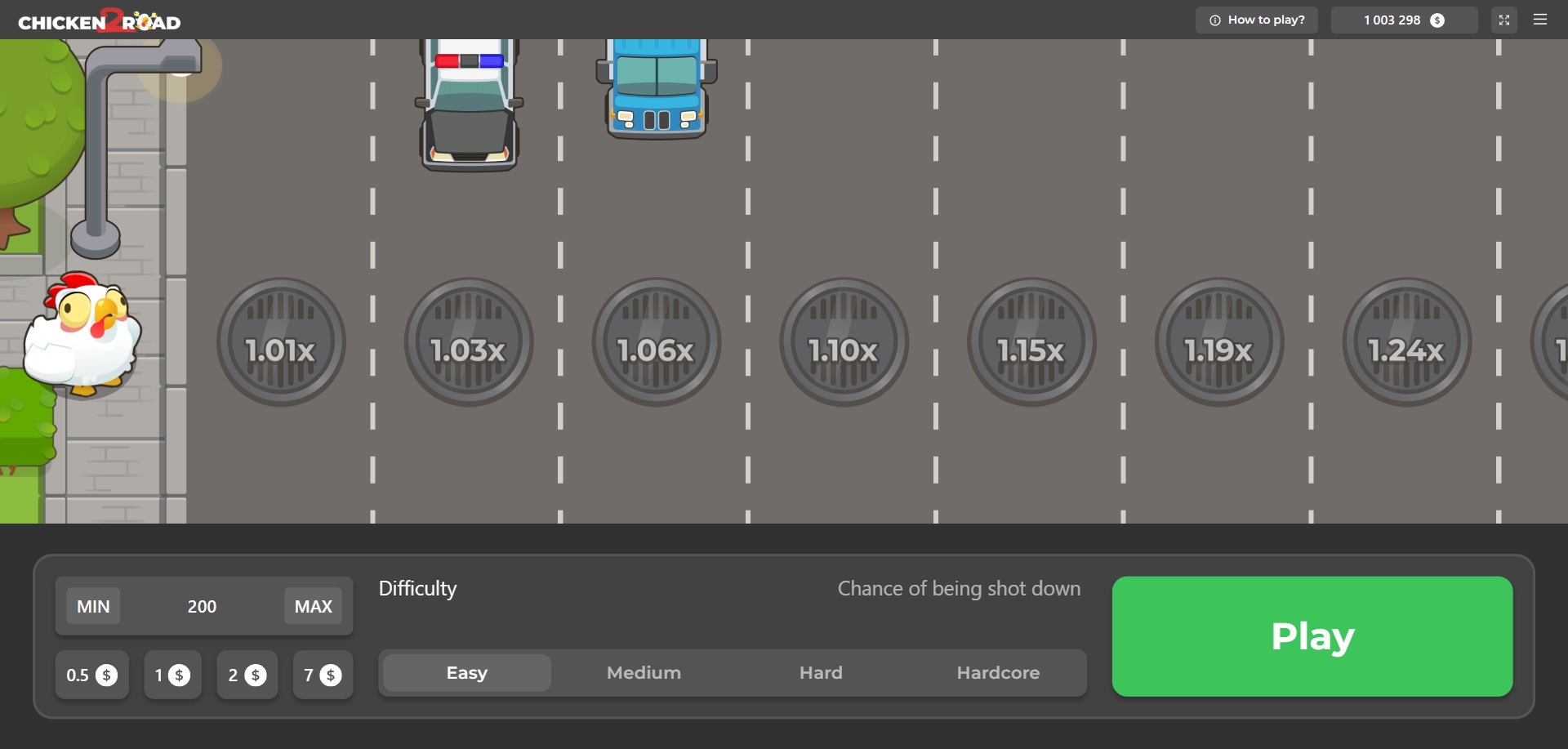 En Chicken Road 2, primero haces tu apuesta. Después elige un nivel de dificultad (de fácil a difícil) que determina el número de carreteras que tienes que pasar y la probabilidad de que te atropellen. Conduce tu pollo por una carretera tras otra sin que te atropelle ningún coche. Cada etapa multiplica tu apuesta. Puedes retirarte en cualquier momento o decidir llegar hasta el final y cruzar con el pollo.