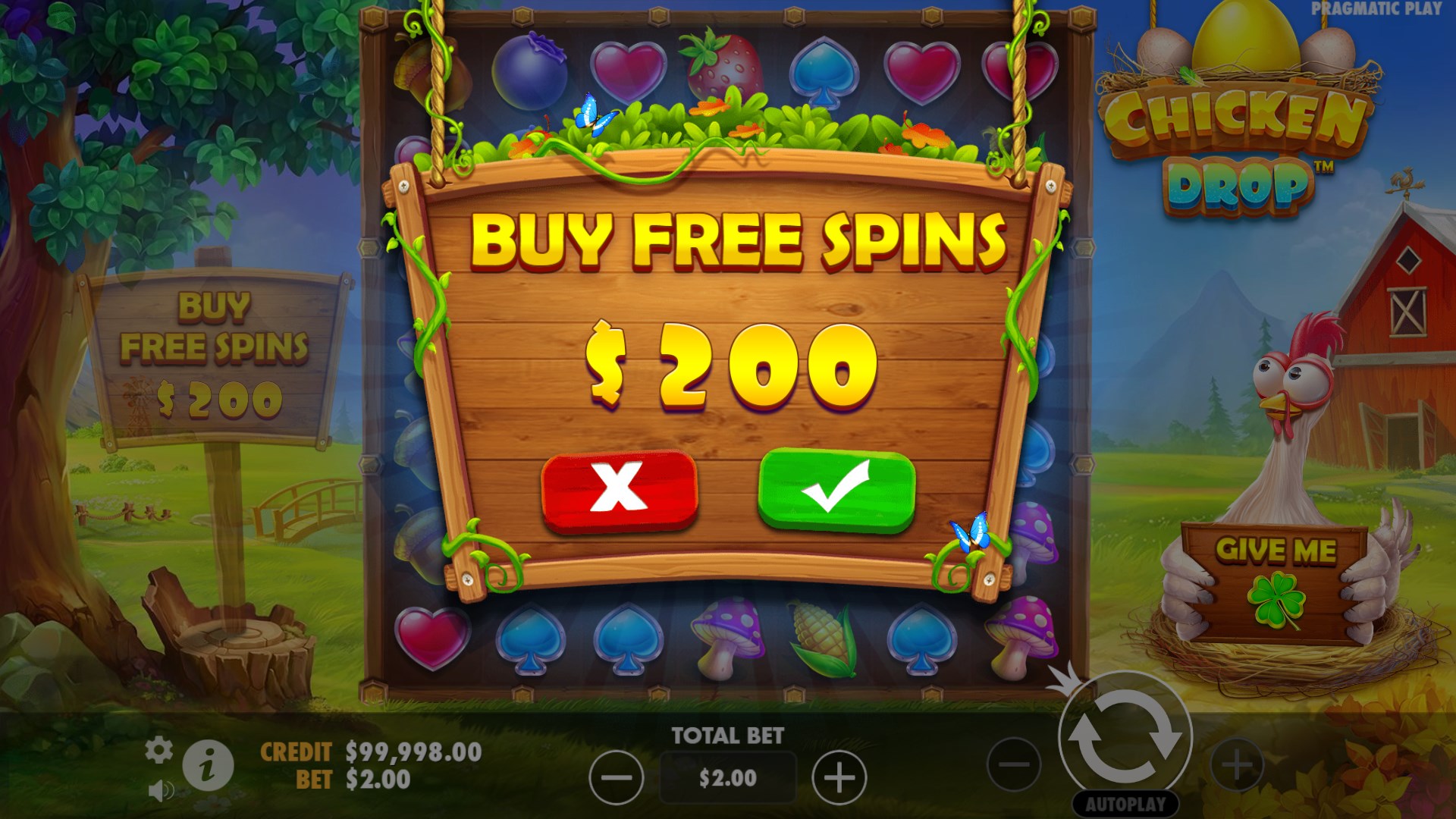 Dla tych, którzy lubią podejmować skalkulowane ryzyko, Chicken Drop zawiera również opcję zakupu bonusu. Za inwestycję w wysokości 100-krotności stawki możesz uzyskać bezpośredni dostęp do darmowych obrotów, omijając cierpliwość wymaganą do ich naturalnego uruchomienia.