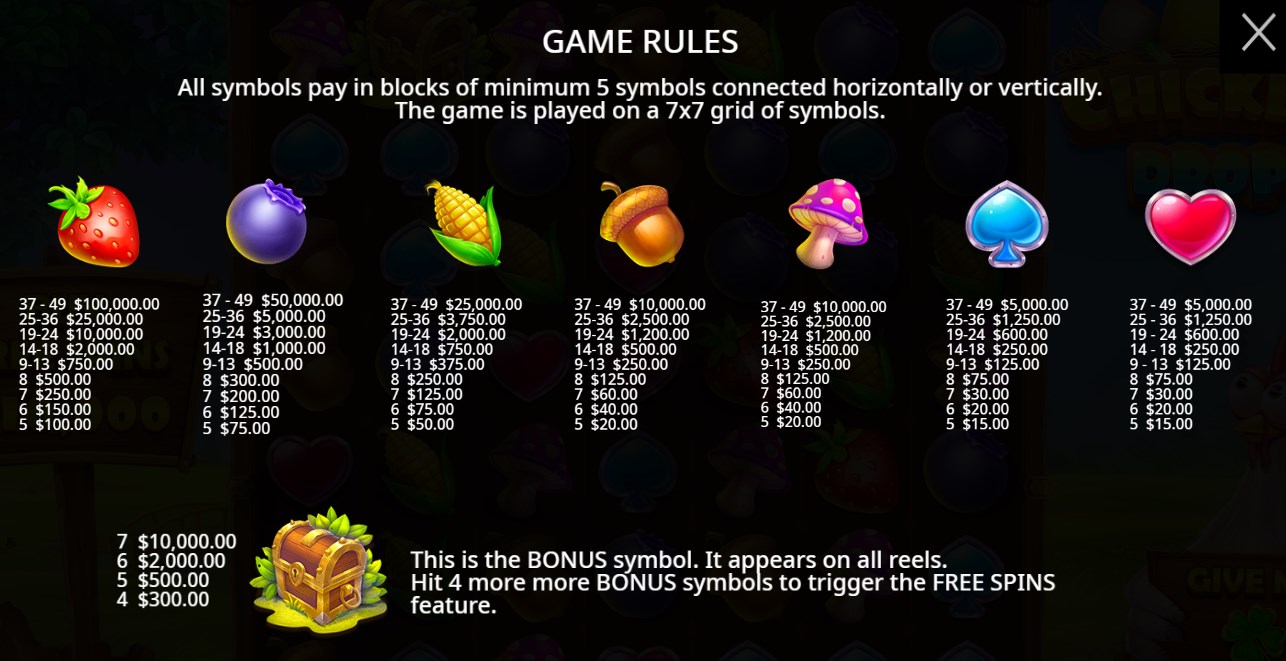 Chicken Drop oferuje wciągające wrażenia z gry dzięki kolorowemu motywowi farma. Dzięki siatce 7×7 gra wykorzystuje mechanizm wypłat klastrowych, co oznacza, że wygrane są generowane, gdy pięć lub więcej sąsiednich symboli ustawi się w linii poziomej lub pionowej. Ta funkcja wyróżnia się na tle tradycyjnych formatów wypłat i tworzy ekscytującą i nieoczekiwaną dynamikę gry.