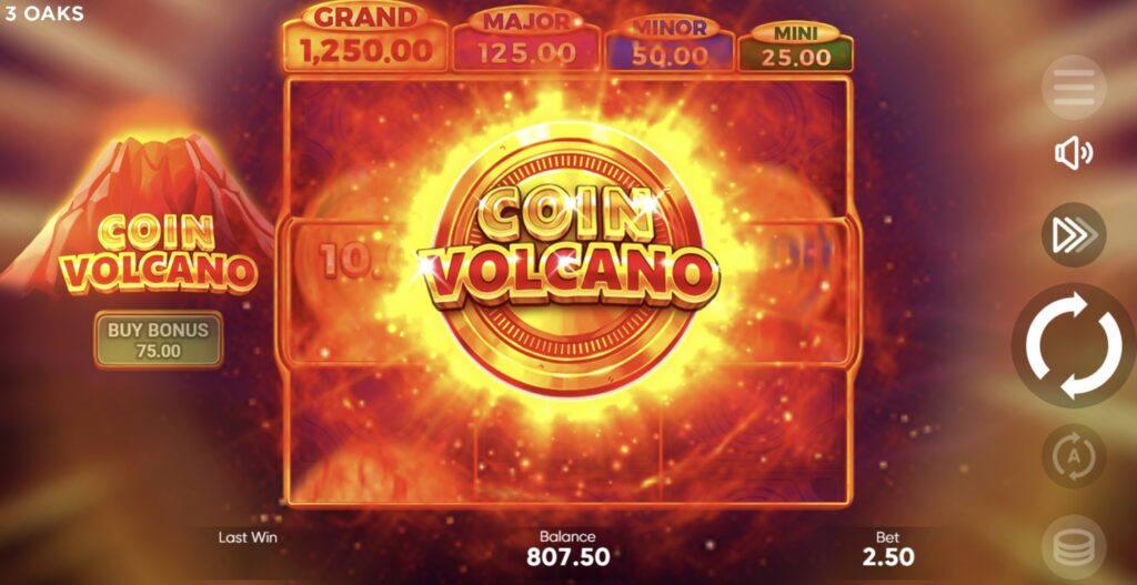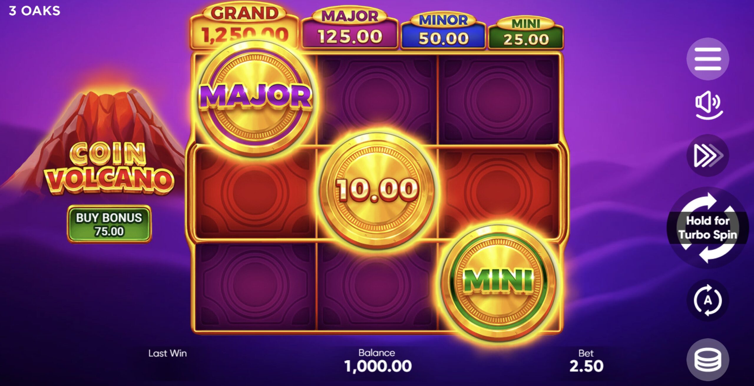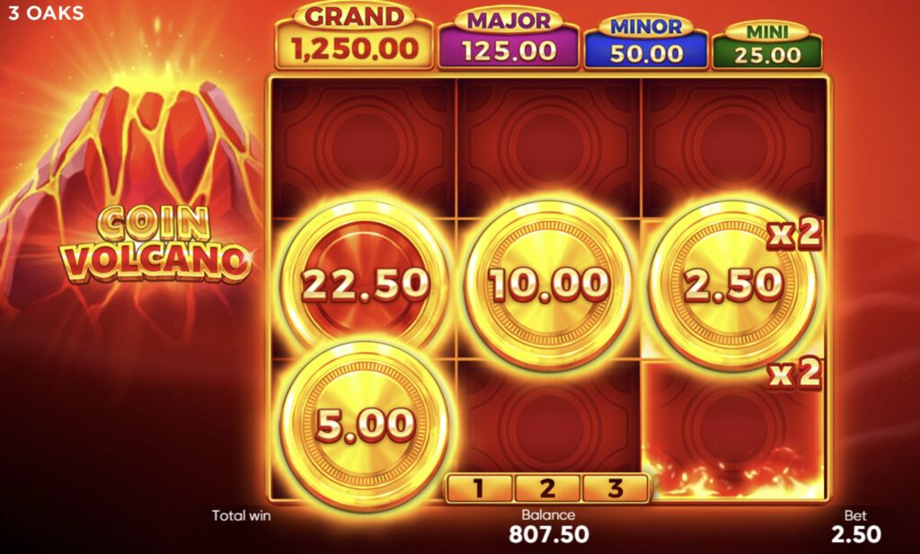 Coin Volcano to automat z siatką 3×3 bez stałych linii wypłat: gdy tylko trzy lub więcej symboli monet pojawi się w dowolnym miejscu, wygrywasz. Posiada system "Hold and Win" z ponownymi obrotami: monety pozostają zablokowane (Sticky Coins) i uruchamiają darmowe obroty, aby zebrać jeszcze więcej monet. Dwa tryby bonusowe (Bonus i Ultra Bonus) oferują mnożniki wygranych o maksymalnym potencjale 25 000 × stawka. Zakłady zazwyczaj wahają się od 0,10 do 60 jednostek na obrót, a współczynnik wypłat wynosi około 95-96 %.