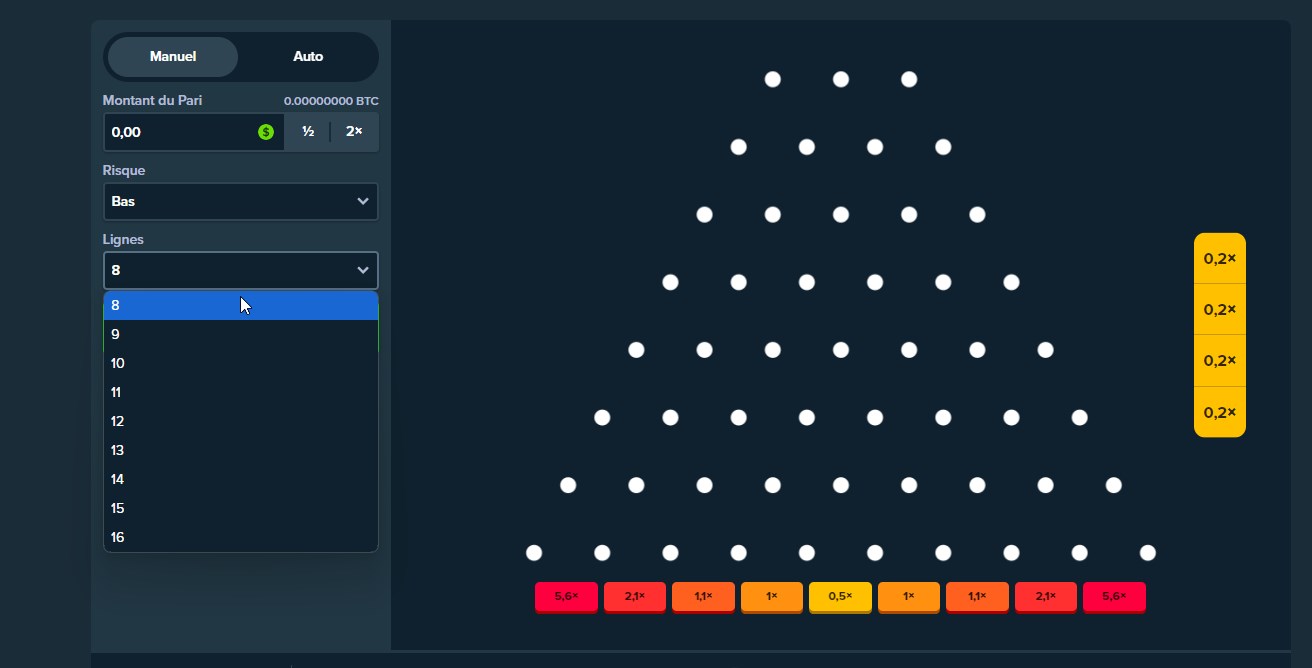 Stawka pozwala modyfikować parametry gry Plinko. Możesz to wykorzystać, aby dostosować je do swojego portfela i celów. Możesz zmienić liczbę kręgli na piramidzie i zmienność. W zależności od potrzeb, ale także od tego, na co możesz sobie pozwolić, używane parametry będą różne. Dla gracza z małym budżetem preferowana jest gra ze średnią lub niską zmiennością. Gracz z większym budżetem może celować w jackpota i zmienić zmienność na wysoką, wybierając jednocześnie maksymalną liczbę spinów (16 linii).