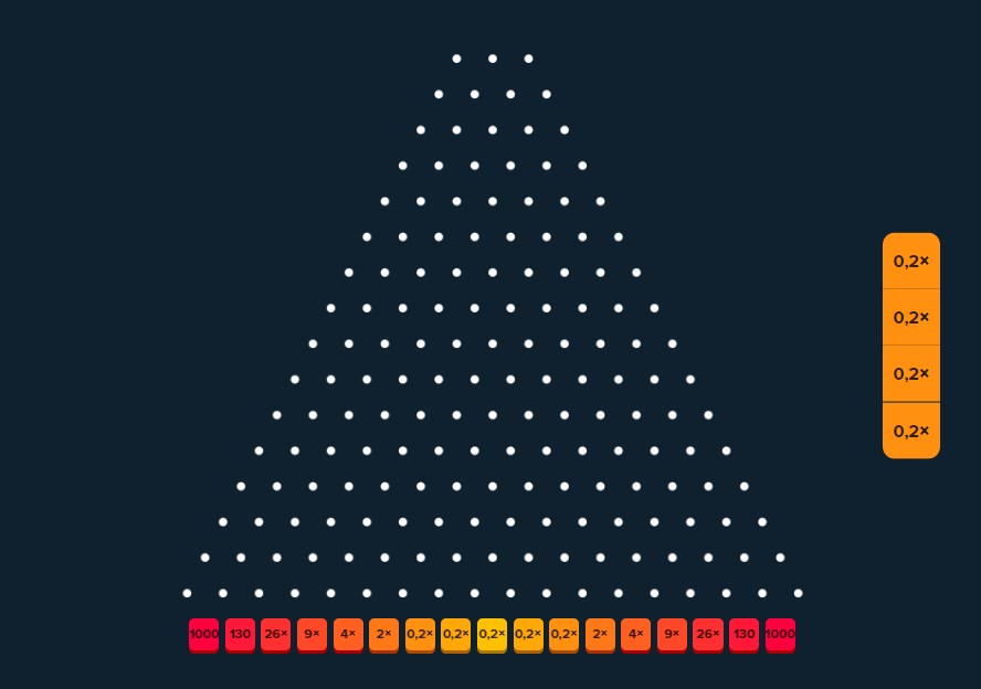 Z wierzchołka piramidy spada określona przez Ciebie liczba kulek. Kulki uderzają w kołki w piramidzie i trafiają na jeden z kwadratów na dole. Każdy z tych kwadratów reprezentuje mnożnik. Im dalej kwadrat znajduje się od centrum, tym wyższy jest jego mnożnik.